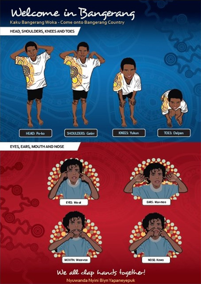The ‘Head, Shoulders, Knees and Toes A2 Poster’ is a graphic of two of the little black trackas doing the actions for head, shoulders, knees and toes. It features the English words for head, shoulders, knees and toes along with the Bangerang words for head, shoulders, knees and toes, so children can sing along to the song on the CD.